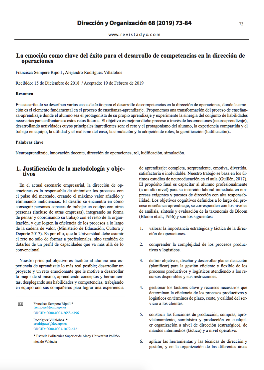 Sempere F., Rodríguez A. (2019). La emoción como clave del éxito para el desarrollo de competencias en la dirección de operaciones. Dirección y Organización, 68, julio 2019, 73-84. ISSN: 1132-175X