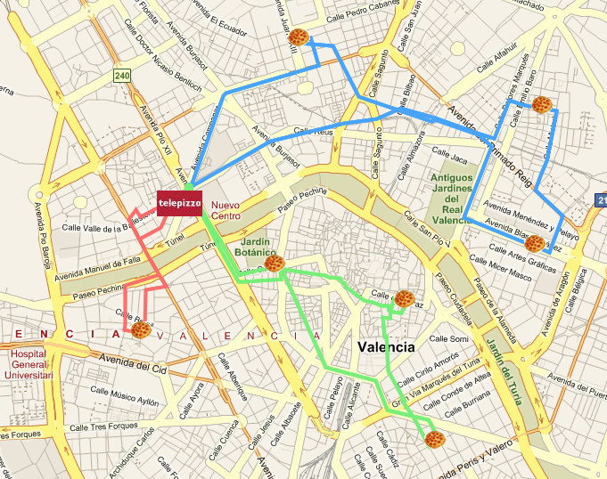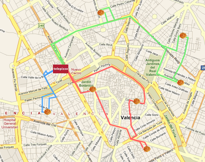 Según la matriz que se utilice vemos en las siguientes imágenes como las rutas resultantes (minimizando distancia total en ambos casos): o bien discurren por calles principales (caminoss rápidos) o bien atajando incluso por el centro histórico de la ciudad (caminos más cortos).