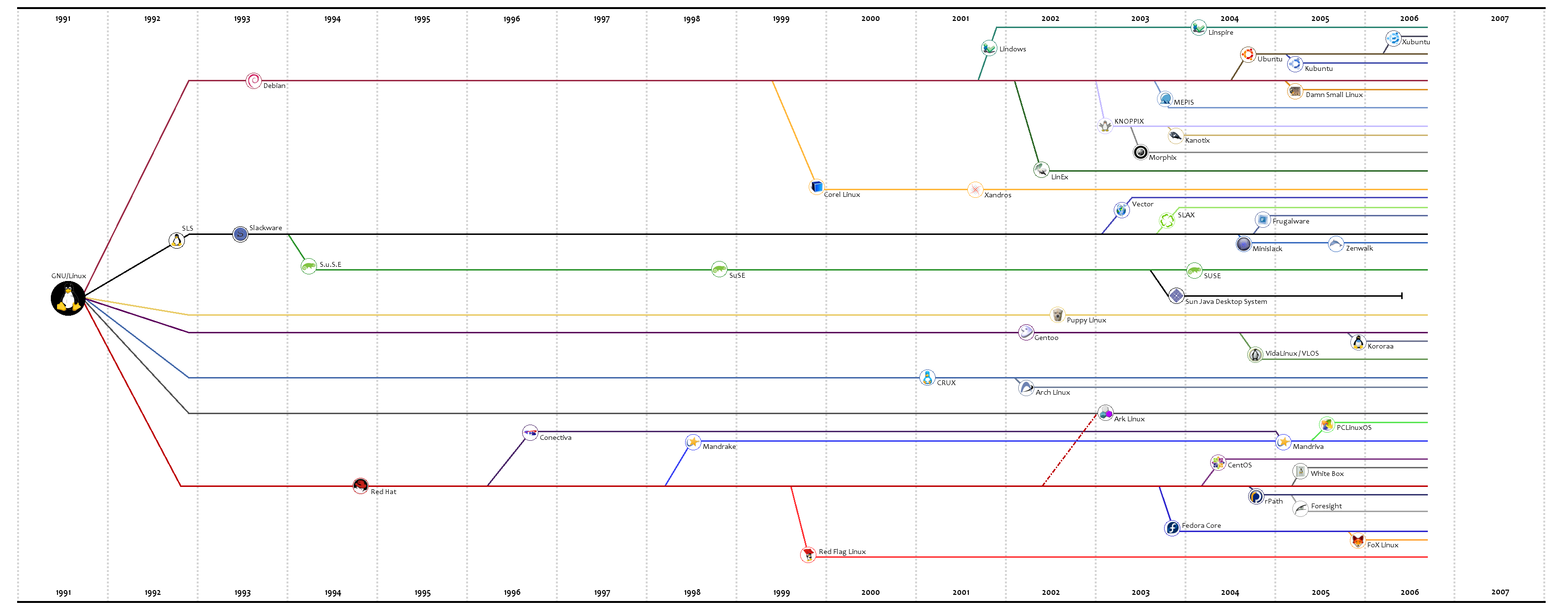 Esta es una simple y bonita representación cronológica de las distribuciones de GNU/Linux, comenzando en el año 1991.