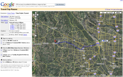 Sabía que ocurriría, era sólo cuestión de tiempo que Google incluyera dentro de sus servicios una herramienta para el cálculo de rutas. Se trata de Google Transit , que es una ampliación a Google Maps . No creo que Google tarde mucho en ampliar estos servicios y los haga accesibles a través de teléfonos móviles con conexión a internet y localización via GPS.