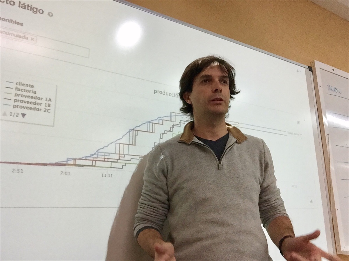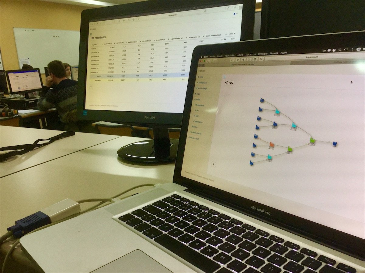 Hoy hemos podido usar las nuevas funciones y análisis que incorpora la nueva versión de implexa. Una de las principales novedades es la posibilidad de visualizar en tiempo real la actividad de todos los actores de la cadena de suministros. Como se puede ver en las siguientes imágenes, el profesor adquiere ‘mirada de halcón’ sobre toda la red y las decisiones y acciones que los alumnos ejecutan durante el juego.