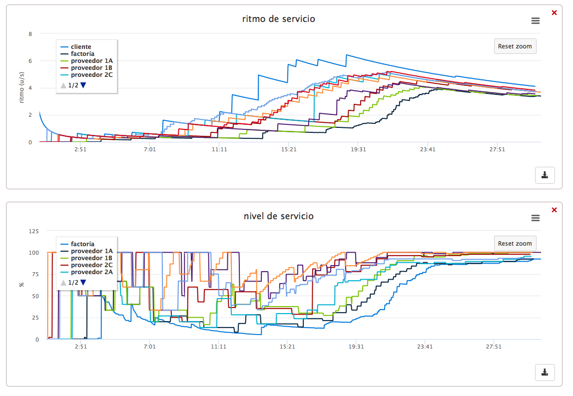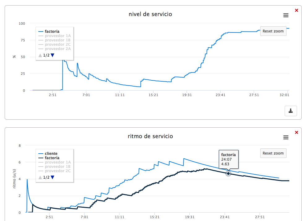 Además, también hemos podido usar el cálculo y representación mejorados de la ratio de amplificación de la demanda; algo imprescindible para controlar el efecto látigo (bullwhip effect). Esta ratio se calcula y se muestra en tiempo real tanto en la tabla de resultados como en una gráfica.
