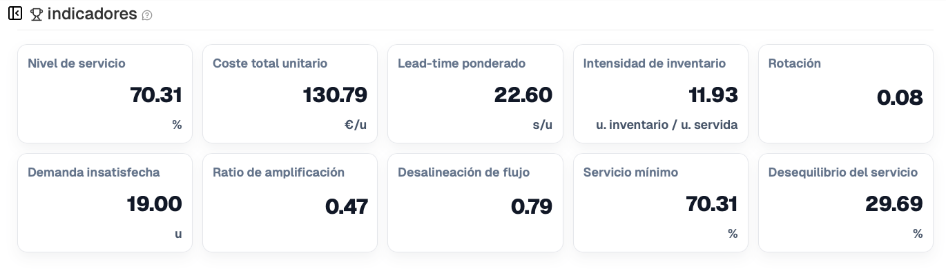 - Gestión de activos y coordinación: intensidad de inventario, rotación, amplificación, desalineación, servicio mínimo y desequilibrio.