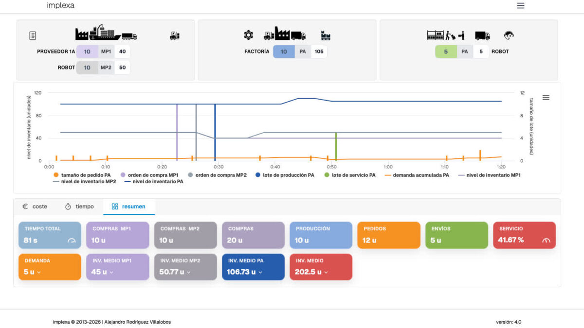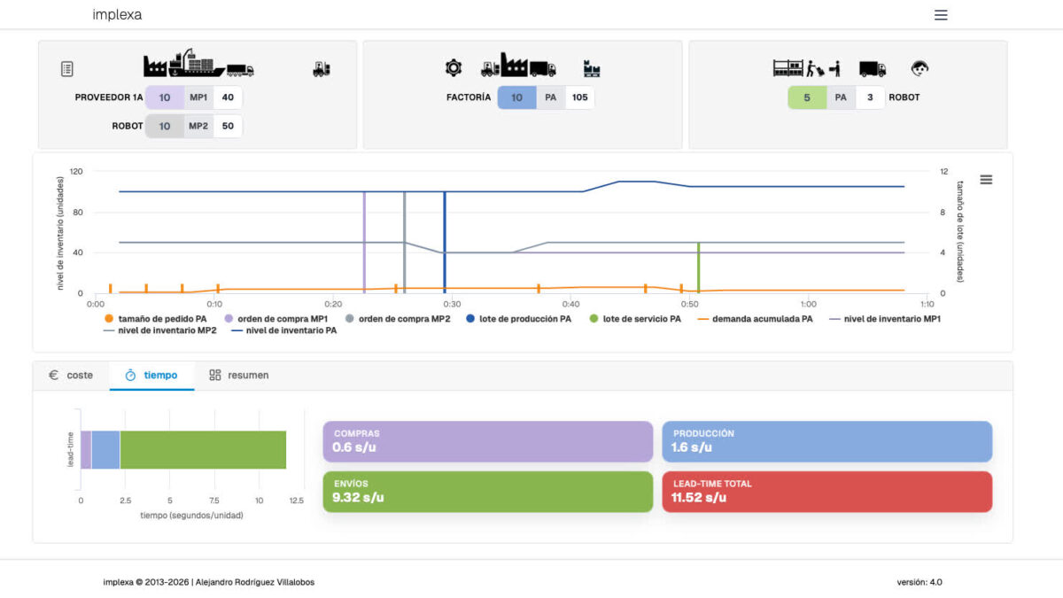 Cada alumno toma decisiones y ejecuta acciones rápidamente, mientras implexa realiza todos los cálculos en tiempo real (costes, niveles de inventario, lead-time, efecto látigo, etc.) y muestra gráficamente el resultado al instante. Todo es digital, en tu pantalla (multi-dispositivo y sistema operativo), sin papeles ni cálculos a mano. implexa está inspirado en el conocido juego de la cerveza (beer game), pero es mucho más.