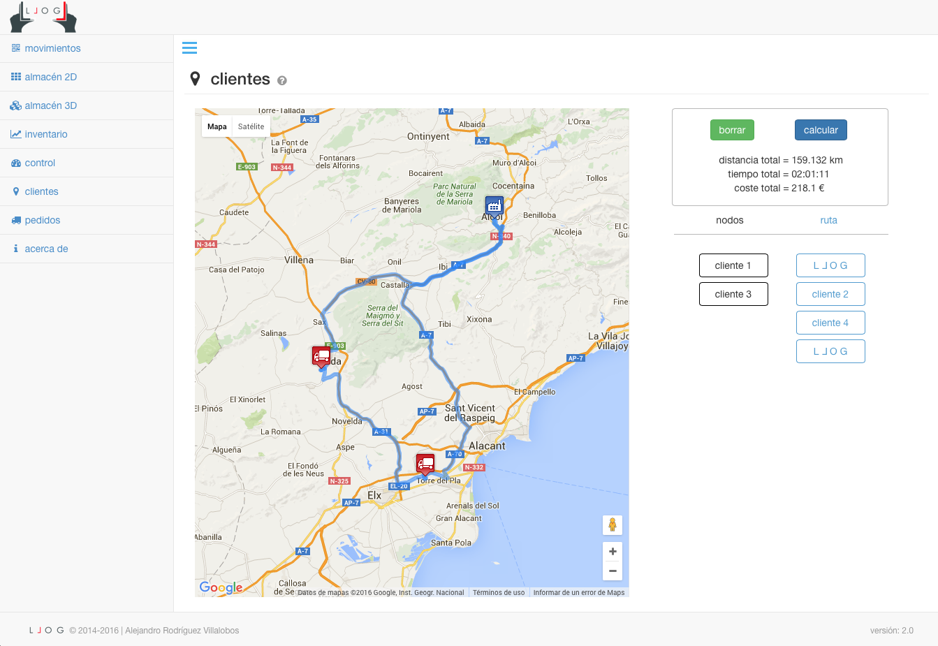 He querido incluir en LLOG, una herramienta que les ayude a aprender todo esto. No se trata de una solucionador u optimizador de rutas, sino más bien de un constructor y evaluador de rutas. En las siguientes imágenes podréis haceros una mejor idea. Se trata de una interfaz muy sencilla en la que los alumnos tienen el conjunto de nodos geolocalizados (nuestra empresa y sus clientes).