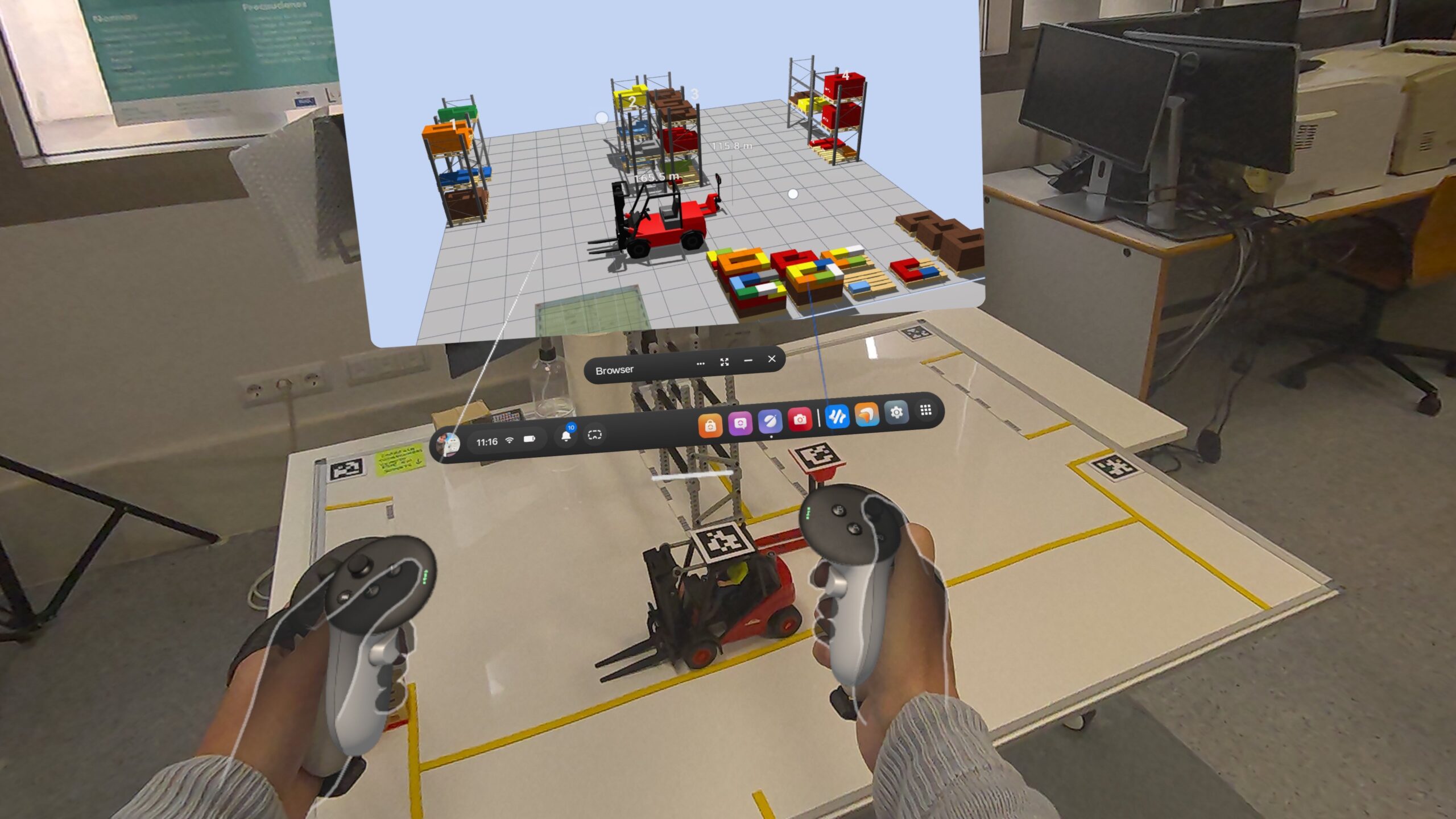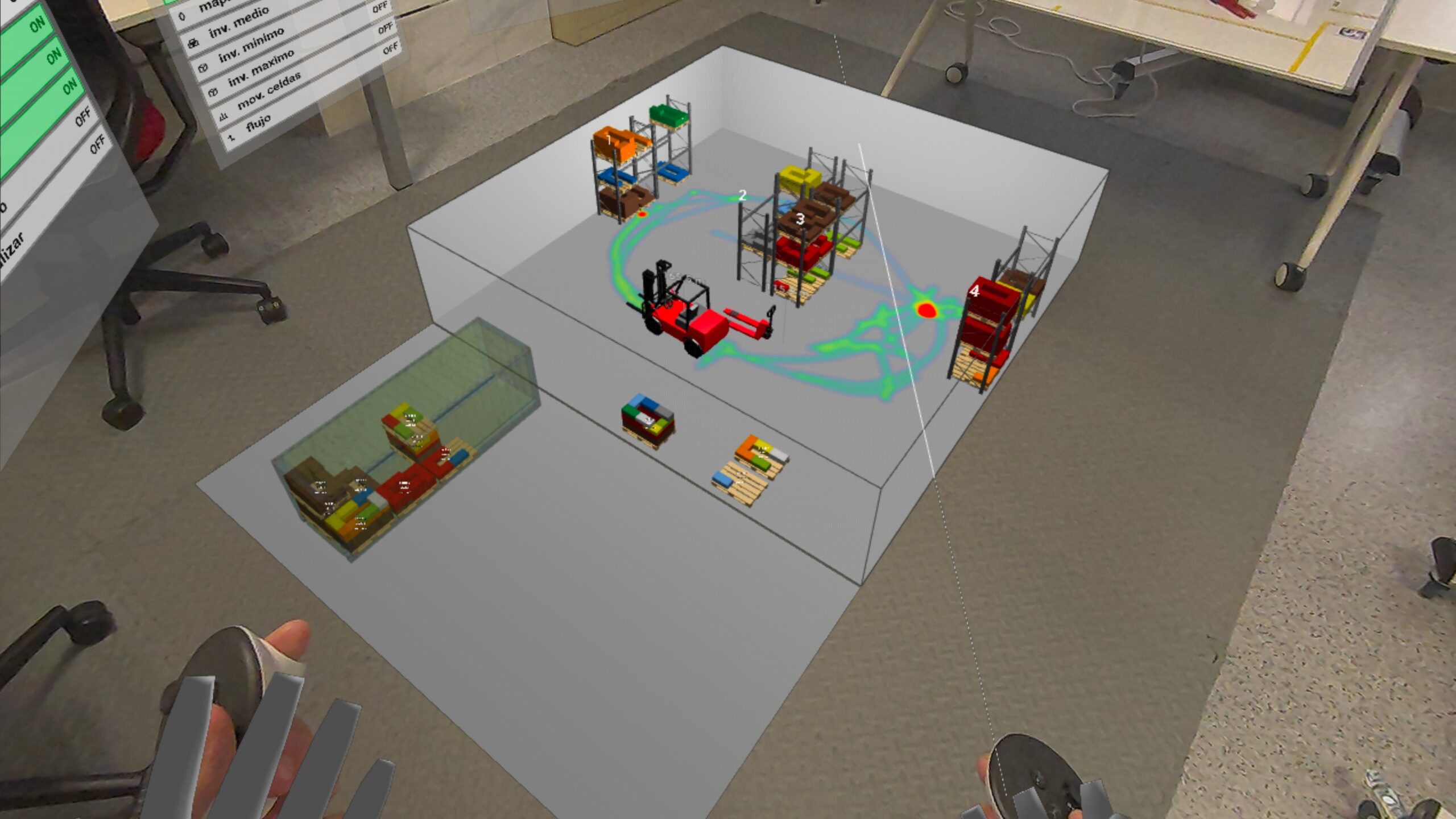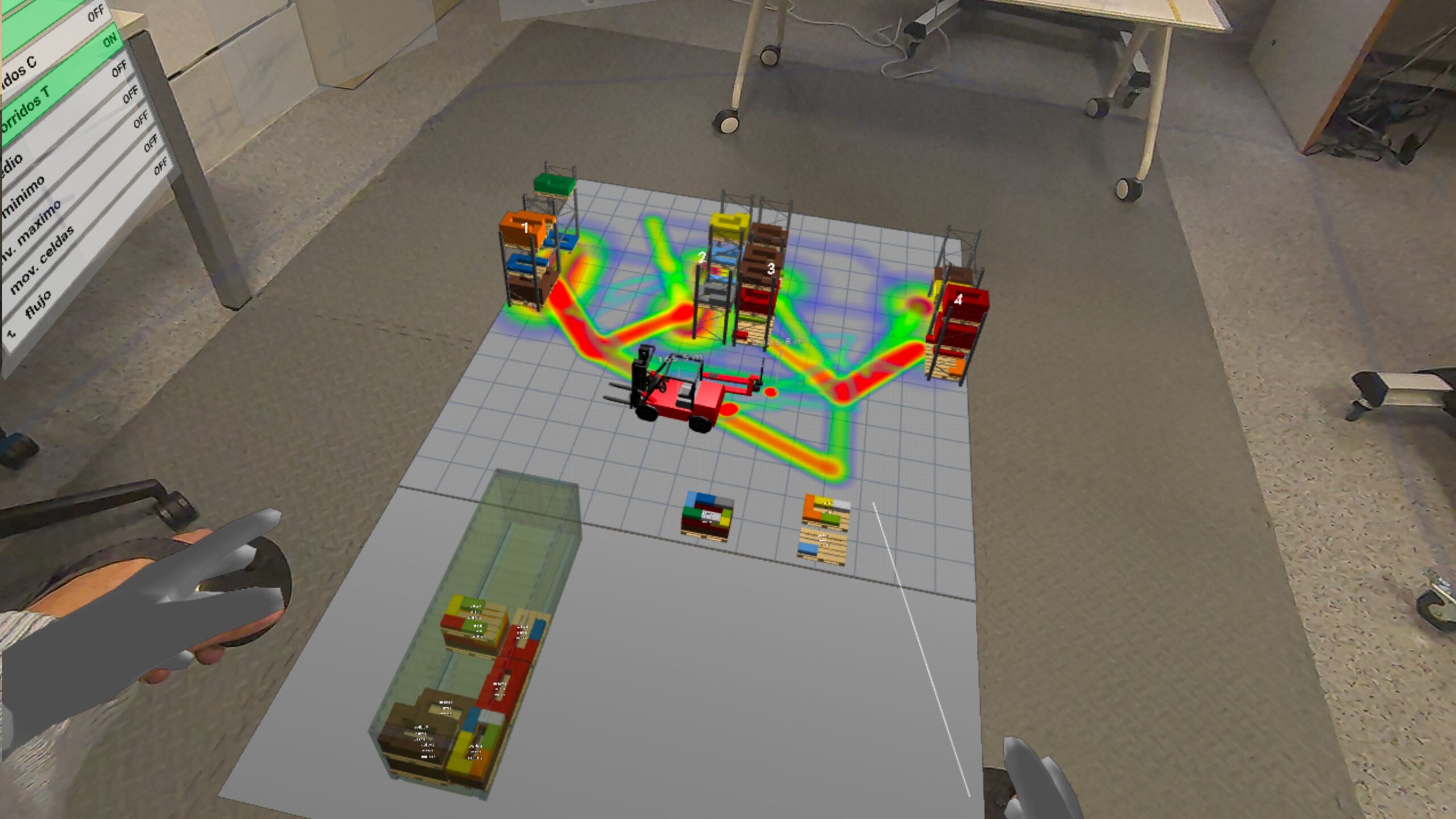 La funcionalidad de VR, por su parte, introduce un grado de inmersión muy superior. En un entorno de realidad virtual, el usuario deja de observar el almacén desde fuera y pasa a situarse dentro de él (tiene tele-presencia). Esta diferencia no es menor: la percepción de distancias, alturas, recorridos, congestiones y condiciones operativas cambia radicalmente cuando se vive en primera persona. Para la formación en logística, esta capacidad es extraordinariamente valiosa, porque permite entrenar la comprensión del flujo físico, la secuencia de operaciones y la interacción entre recursos sin necesidad de intervenir sobre una instalación real. En términos docentes, la VR favorece un aprendizaje experiencial mucho más sólido, especialmente en materias relacionadas con la distribución en planta, la manutención, la seguridad, el picking, la paletización, la carga y las expediciones.