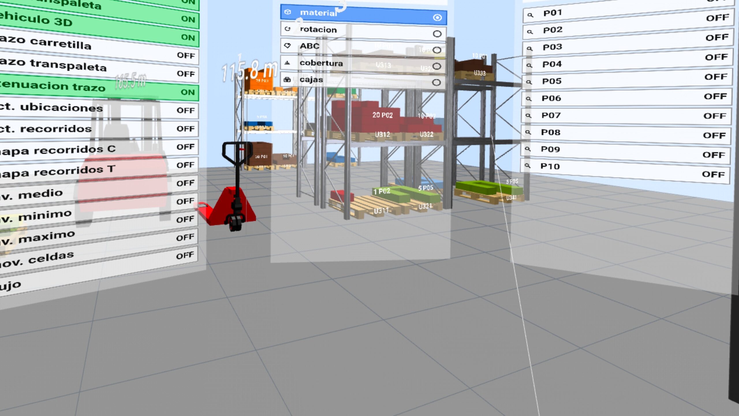 Otro elemento diferencial de gran valor es el cálculo y representación de indicadores logísticos directamente sobre el entorno visual. La potencia de LLOG aumenta de forma notable cuando la observación espacial se combina con analítica operativa. Poder calcular y representar indicadores de rotación, cobertura, inventario, recorridos o mapas de calor convierte la plataforma en un instrumento de enorme utilidad para la evaluación integral del sistema. Los mapas de calor, por ejemplo, permiten detectar concentraciones de actividad y zonas de saturación; los indicadores de recorridos ayudan a evaluar la eficiencia de las rutas y del picking; la rotación y la cobertura aportan información clave para la gestión del stock (criterios de re-ubicación y slotting); y la visibilidad del inventario mejora la comprensión de la disponibilidad y de los niveles de servicio (cobertura, rupturas de stock).