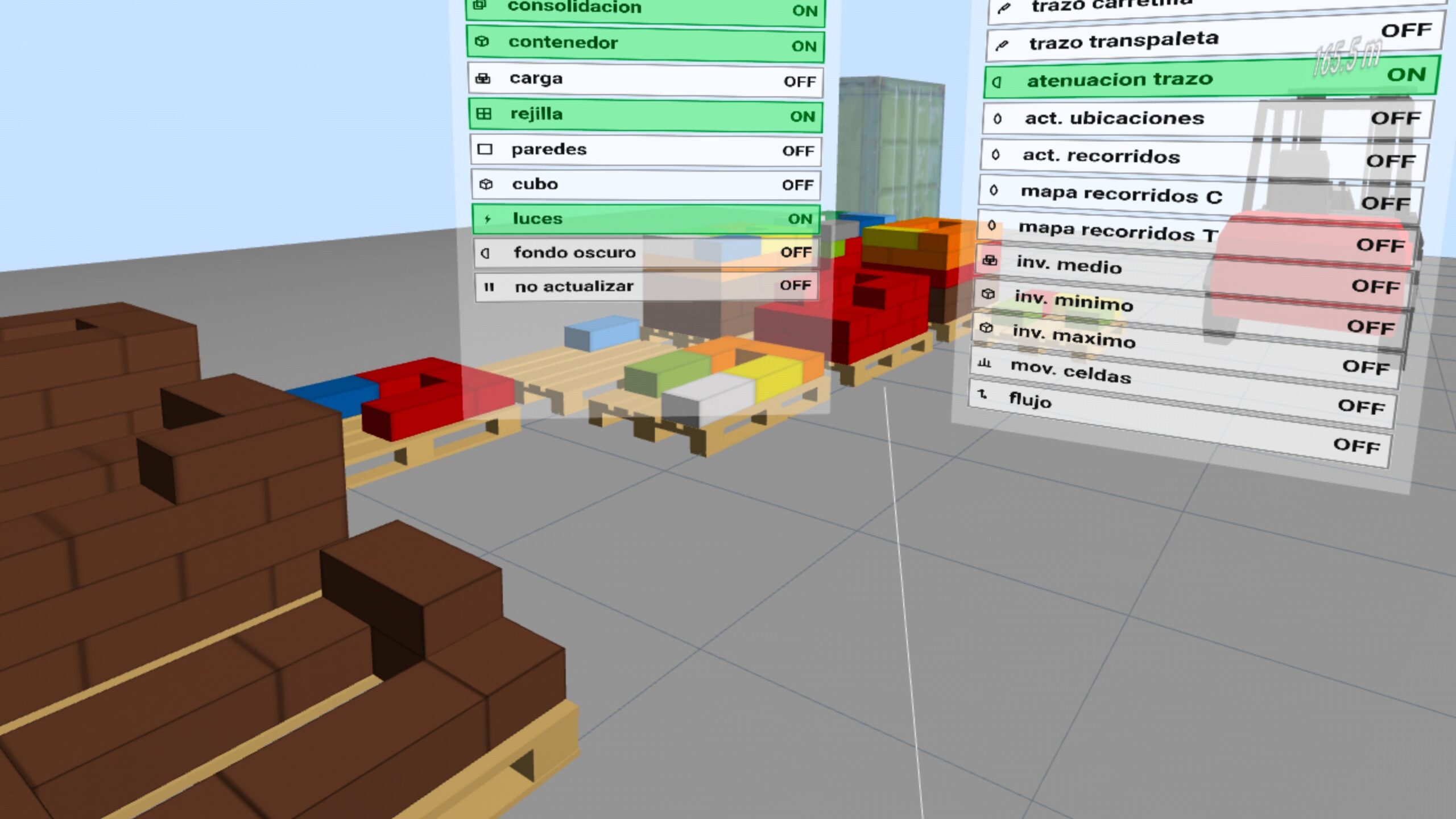 Igualmente importante es la visualización del paletizado y de la carga del contenedor. En la docencia logística, estos contenidos suelen presentar una dificultad específica: el estudiante entiende la teoría, pero no siempre alcanza a visualizar con rigor las implicaciones espaciales y operativas de una mala configuración de carga. LLOG contribuye de manera muy significativa a resolver este problema, porque permite representar cómo se construyen las unidades de carga, cómo se ocupan los espacios, qué criterios de estabilidad o aprovechamiento volumétrico intervienen y cómo impactan estas decisiones en la expedición. Desde el punto de vista profesional, esto se traduce en una mejor comprensión del uso del espacio, de la seguridad de carga y de la eficiencia del transporte.