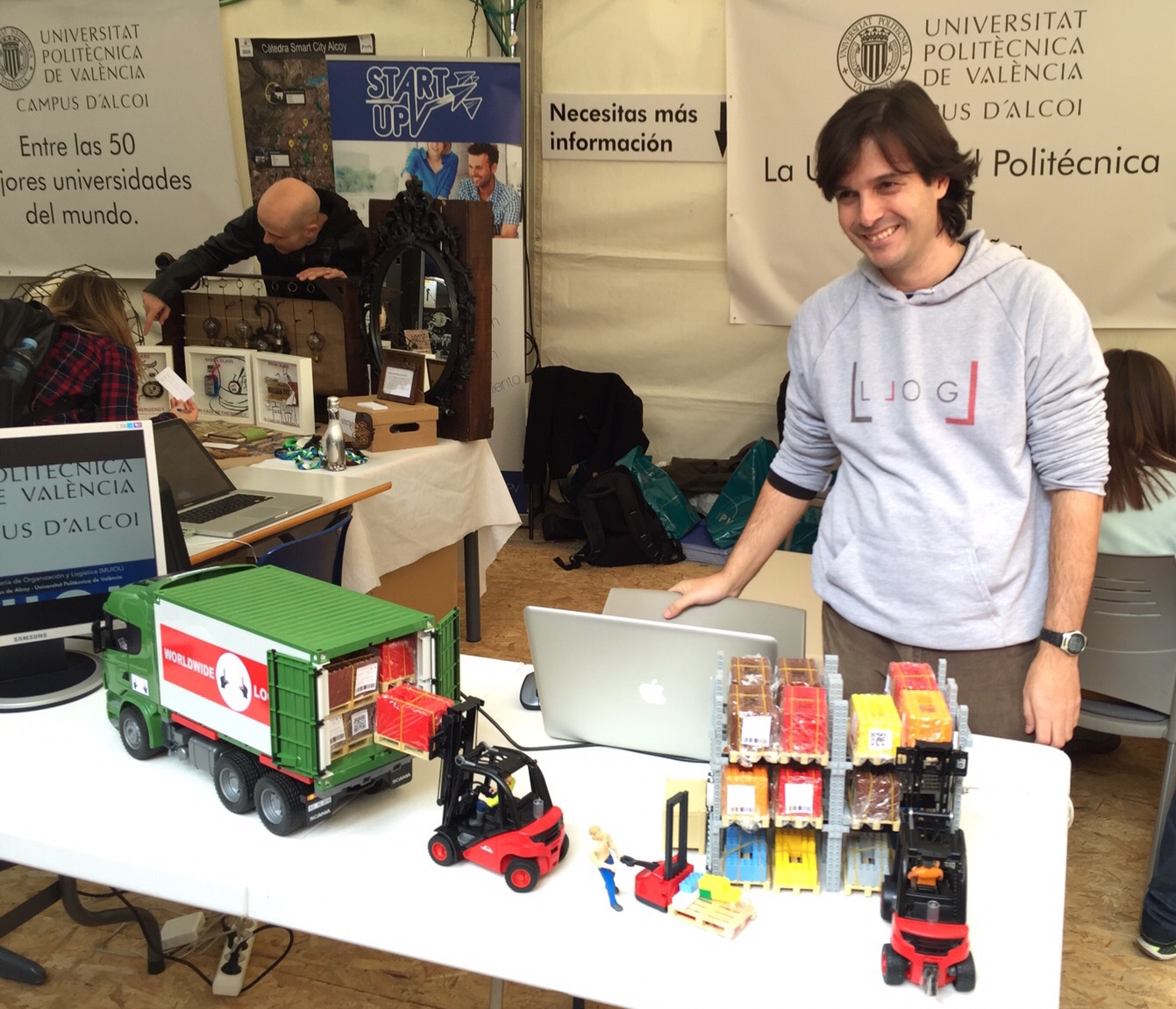 Además de lo genial que fue estar con los niños y niñas, también fue muy interesante conversar con adultos que se paraban a preguntar porque precisamente trabajaban en operaciones logísticas. Pude hablar tranquilamente con transportistas, jefes de almacén, empresarios, etc. y explicarles con detalle el objetivo de LLOG en la formación universitaria, en la formación de directivos, y como línea de investigación. Intercambiamos datos de contacto con algunos de ellos.
