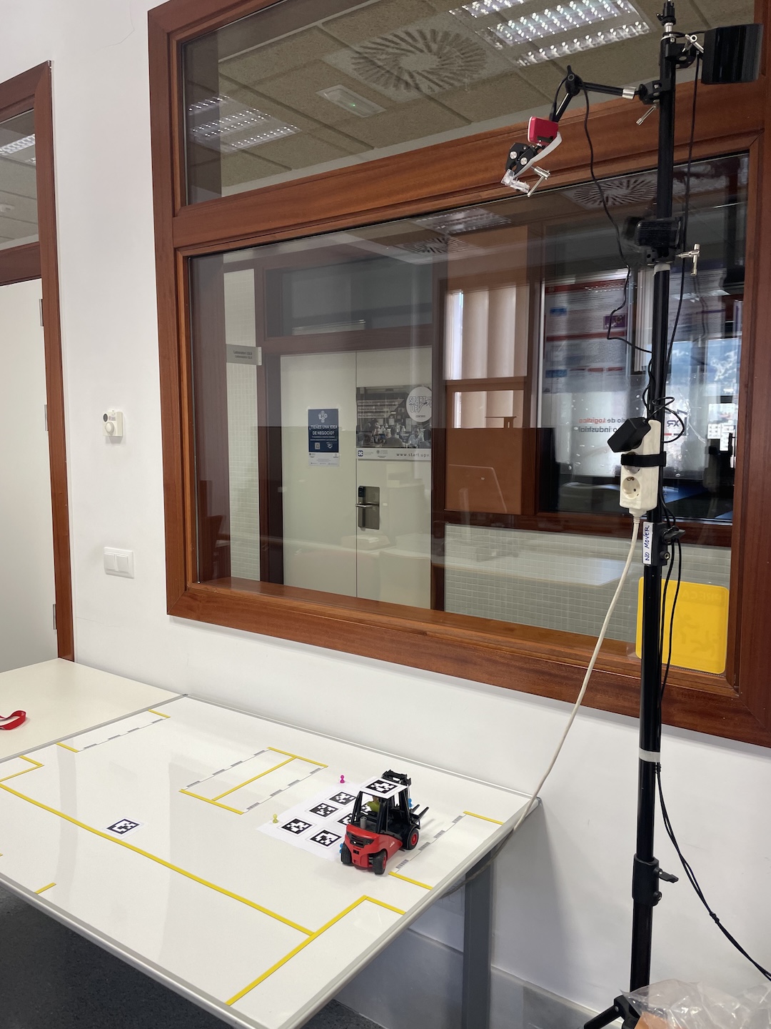 El primer prototipo ha sido desarrollado gracias a un módulo de cámara unido a una Raspberry Pi Zero 2W, que está colocada en un trípode sobre la maqueta del almacén. En la Raspberry Pi Zero he programado un servicio de visión artificial y reconocimiento de etiquetas QR (AprilTag).