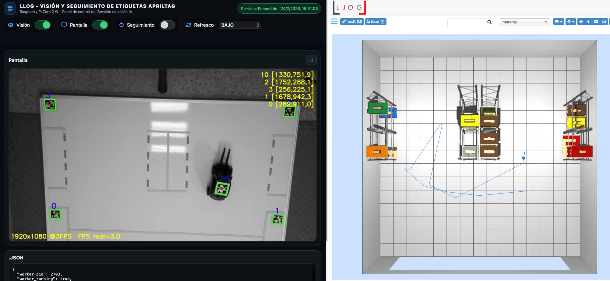 El servicio de visión artificial debe ser robusto (frente a movimientos del tablero, vibraciones del trípode, posibles ocultaciones), ágil (seguimiento en tiempo real de varias etiquetas simultáneamente) y preciso (calibración automática, un pequeño error en pixeles puede suponer un error mayor en el almacén, hay que corregir también el ángulo de visión y perspectiva de la cámara). Esos datos se van subiendo y actualizando en el servidor de la aplicación LLOG en tiempo real.