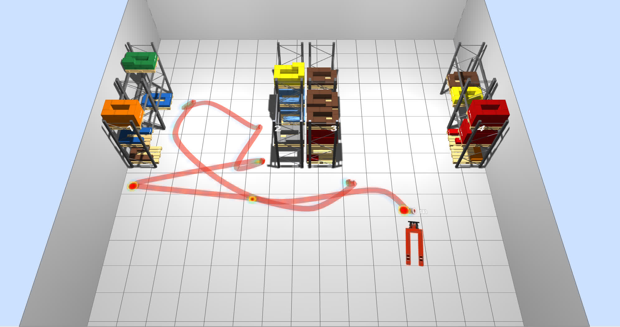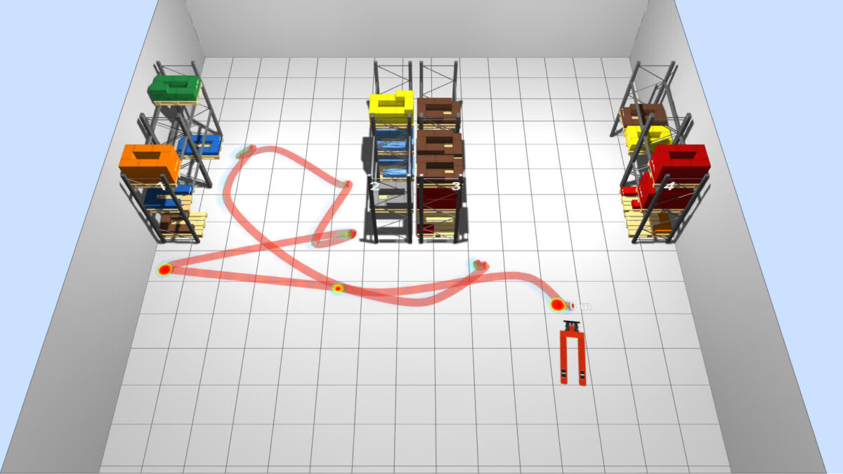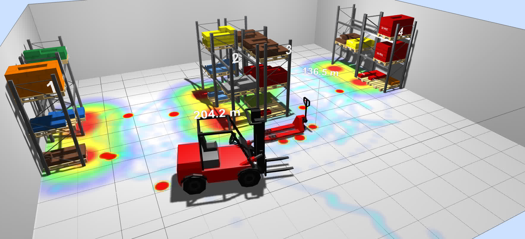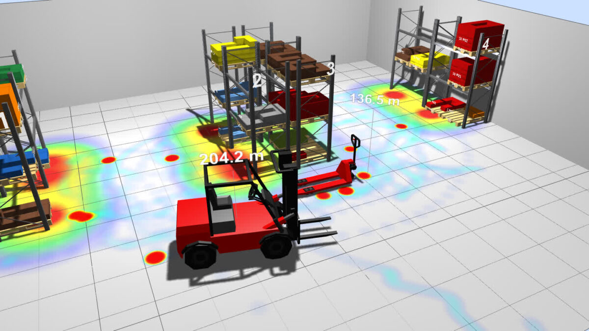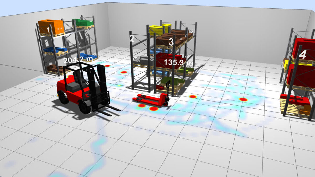 Por último, se pueden representar diferentes mapas de calor (capas de información) para analizar las zonas más frecuentadas, el trasiego y congestión de los pasillos, flujos de productos, etc.