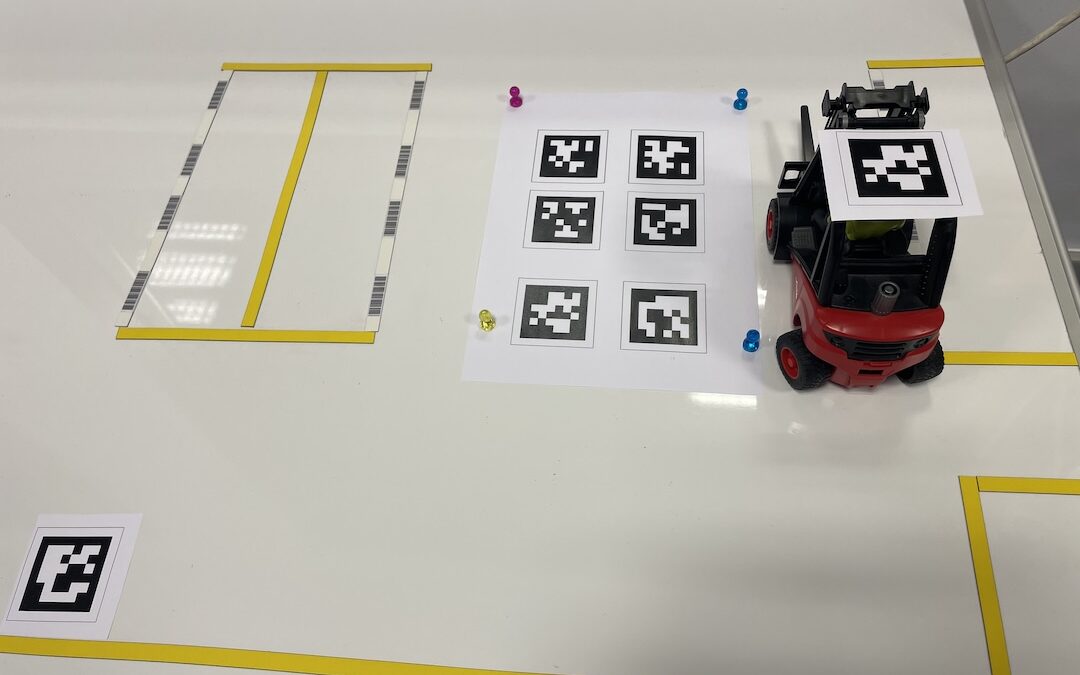 A partir de ahí viene lo divertido. Hacer una representación en tiempo real de las posiciones y ángulos de los vehículos dentro del almacén (carretillas y transpaletas). Esta representación se actualiza automáticamente cuando mis alumnos mueven los juguetes de la maqueta dentro del almacén.