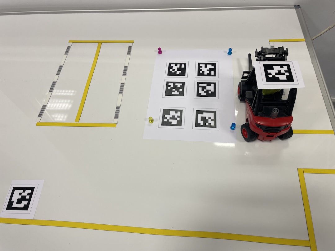 A partir de esta identificación de las etiquetas se obtienen las coordenadas y el ángulo de las etiquetas en la imagen (pixeles). Después hay que convertir estas coordenadas en pixeles, a coordenadas en la maqueta (centímetros), y por último a coordenadas del almacén en el mundo real (metros).