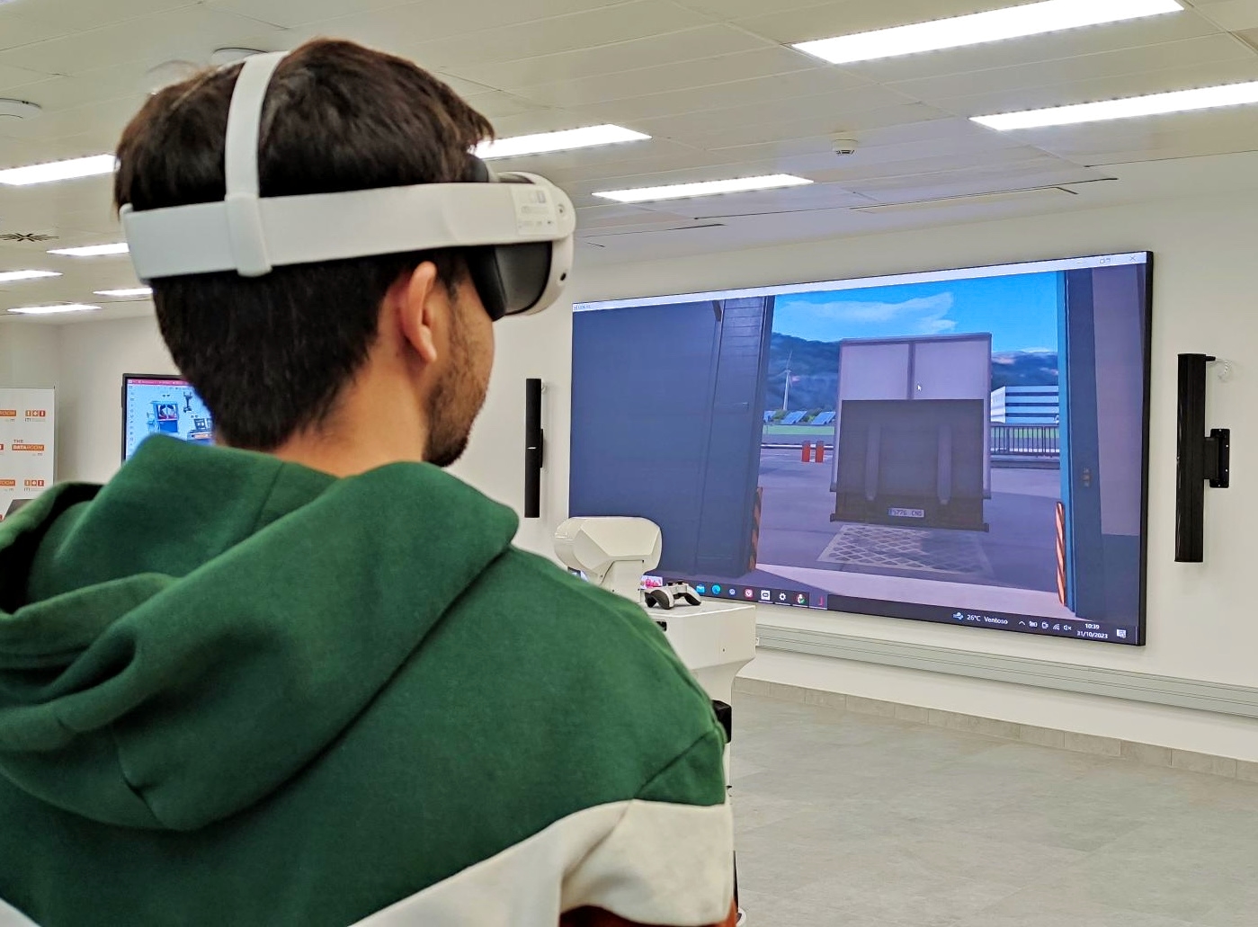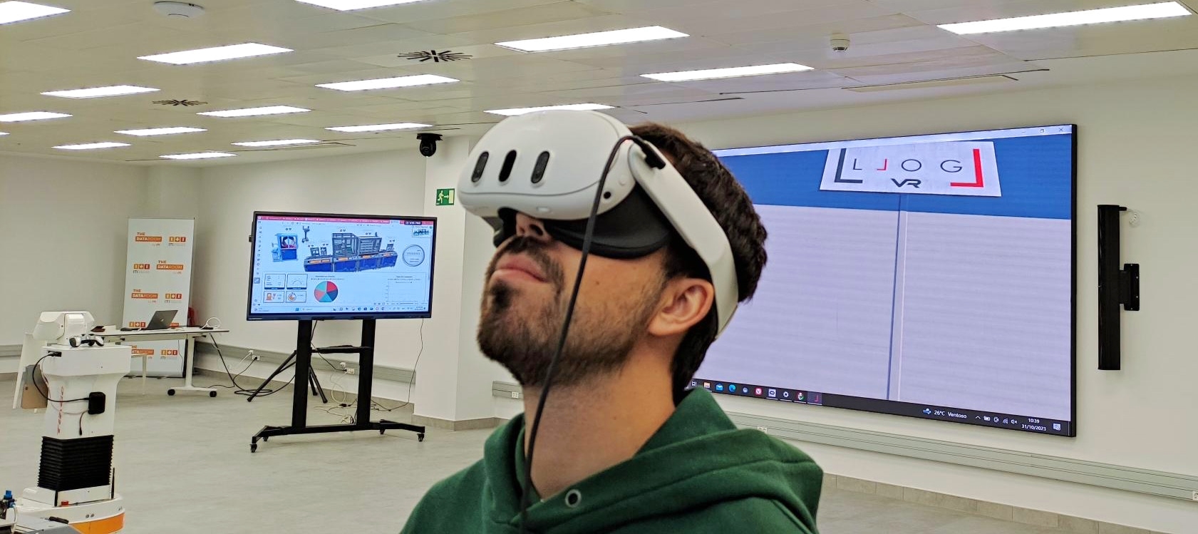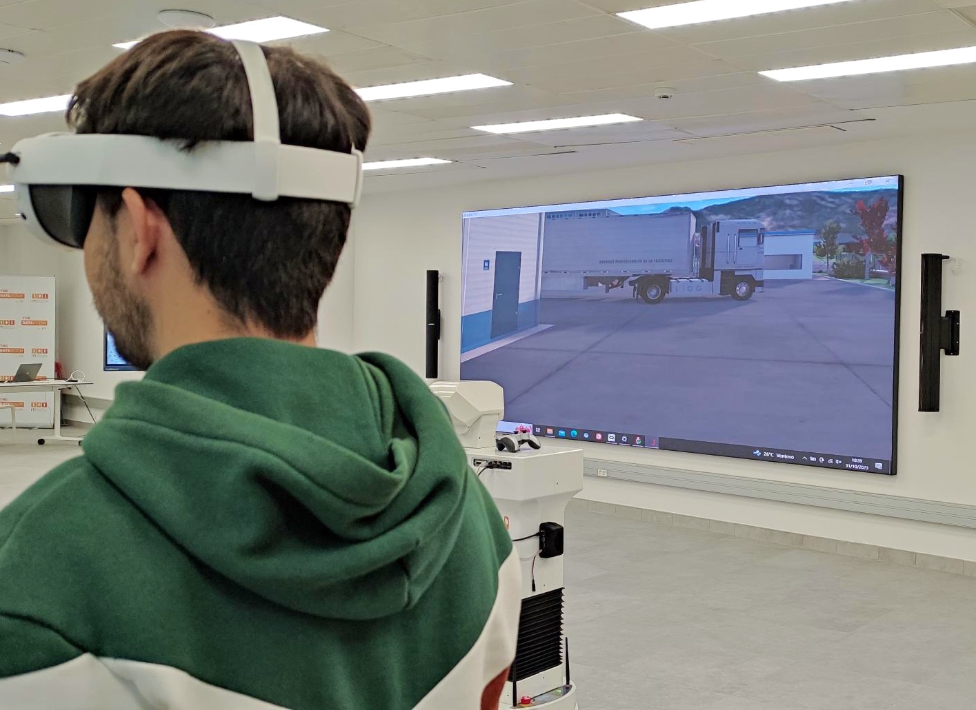 El bonus de esta prueba, fue ver LLOG VR en la pantalla gigante (video wall) que tienen en el nuevo DATA ROOM del ITI en Paterna (Valencia). ¡Brutal! no sólo el usuario que lleva las gafas tiene la sensación de ser teletransportado a un centro logístico real, sino que el resto de usuario lo ven gigante en la pared.