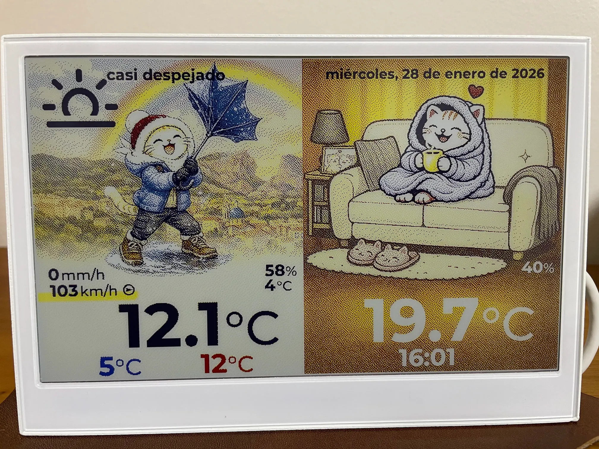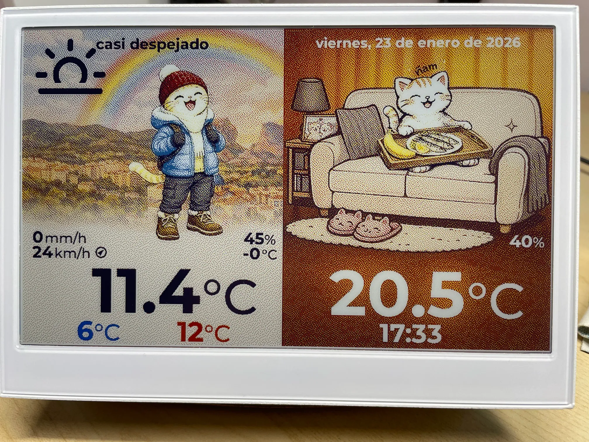 Una de las principales funciones es mostrar las condiciones meteorológicas de mi ciudad, y la temperatura y humedad relativa del hogar. Los datos de las condiciones meteo las puedes obtener de diferentes sitios web públicos o estaciones meteo de tu vecindario. Y los datos de temperatura y humedad relativa de tu hogar los proporciona el propio dispositivo, o lo puedes obtener con cualquier otro sensor IoT que tengas en casa, como por ejemplo el de Shelly H&T Gen3.
