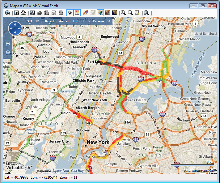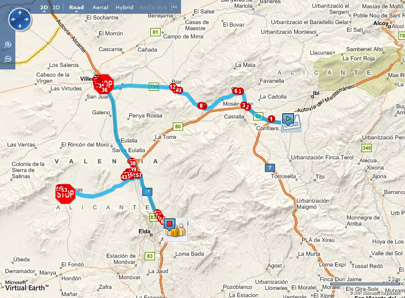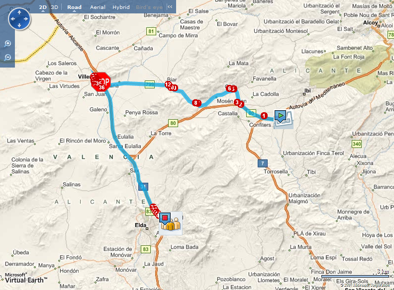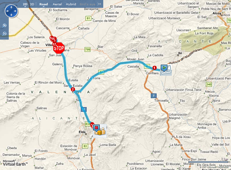 Gracias a la nueva funcionalidad de MsVirtualEarth v.6. Las imágenes muestran un ejemplo de itinerario con una parada intermedia (camino más rápido, camino más corto)