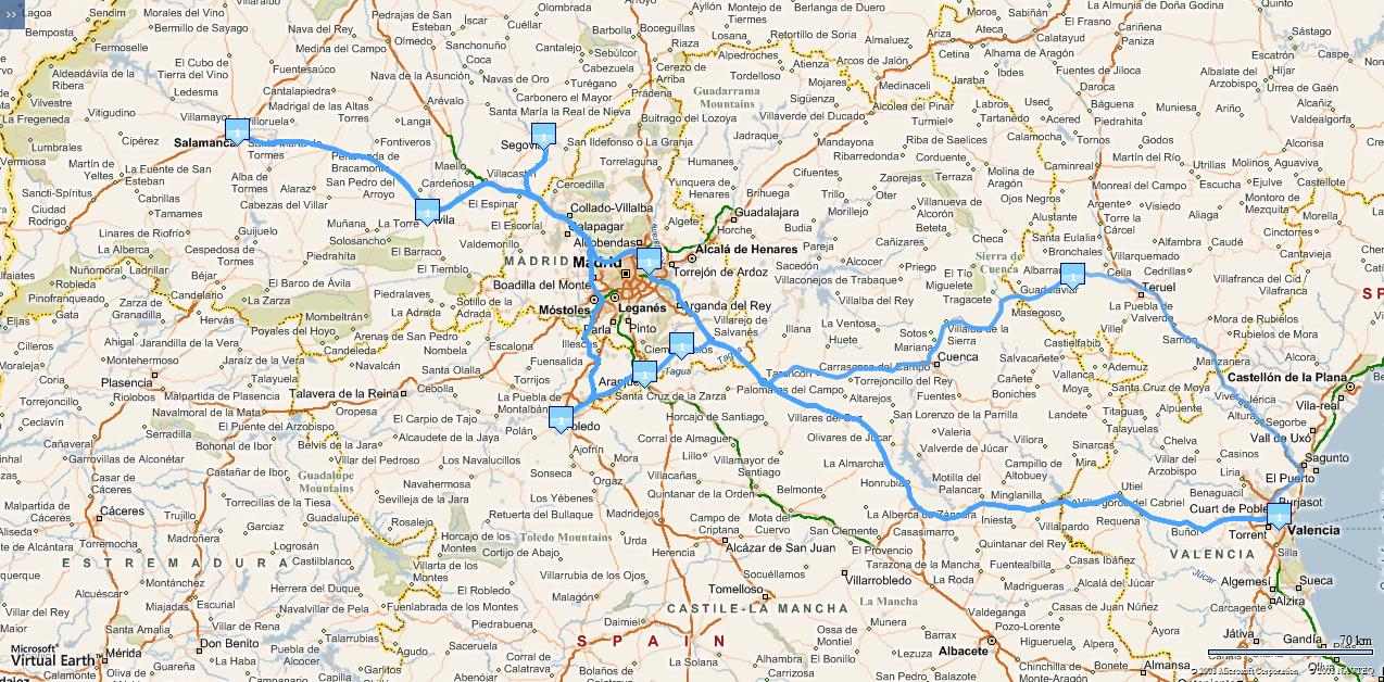Estos días he estado haciendo de Hacker. Intentando exprimir al máximo las posibilidades cartográficas de Ms Virtual Earth y de Google Maps. El resultado de todo este ingenio ha sido que Rutas ha mejorado considerablemente su precisión y nivel de detalle en los itinerarios que forman parte de las rutas solución. Si antes era difícil, ahora es imposible perderse! Fijaros en la siguiente imagen, donde se puede ver con total precisión cómo moverse por una de las circunvalaciones de Madrid a su paso por Fuenlabrada. Si no eres de esa zona, en ocasiones es difícil moverse entre tanta intersección y autovía; es importantes que las instrucciones del itinerario estén bien claras.