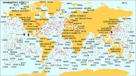 En el mapa global, podemos localizar los barcos por su nombre, y también por su código (call sign).