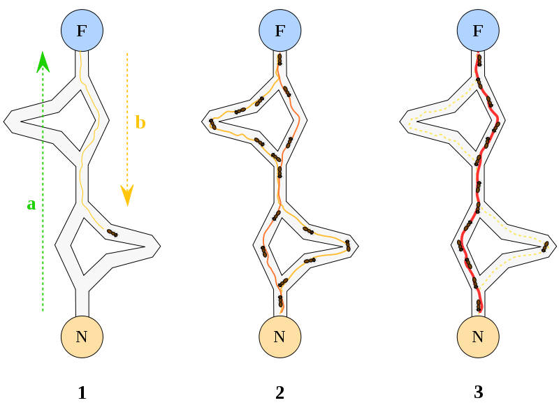 Cuanto mayor número de hormigas viajan tras esta trayectoria, más intenso es el olor de esta sustancia lo que provoca en las hormigas el estímulo de seguir en esa trayectoria.